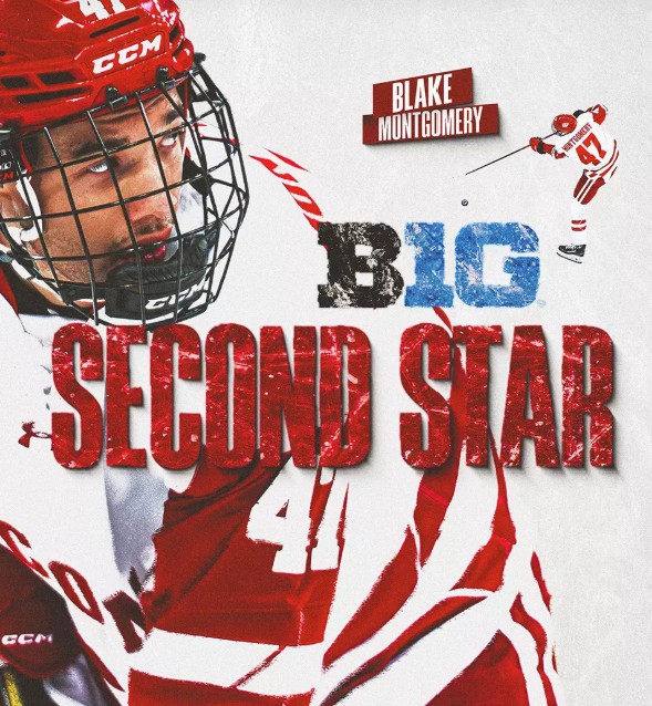 Nine different players including Blake Montgomery scored to lead the Wisconsin Men's Hockey team to a 9-2 victory at Notre Dame at Compton Family Ice Arena.