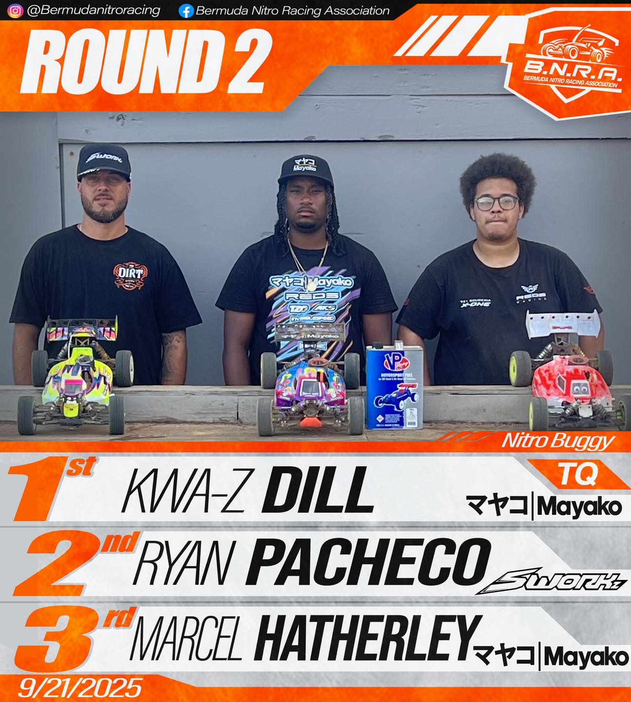 Round Two of the Bermuda Nitro Racing Association at Southside Racetrack delivered another day of fast-paced action, highlighted by a commanding performance in the Buggy Class and a hard-fought win in the E-Buggy division.